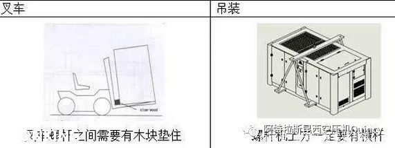 昆西空壓機(jī)在安裝前需要放置在指定位置,在運(yùn)輸放置過(guò)程中可以使用叉車(chē)或者吊裝的方式進(jìn)行運(yùn)輸放置,但是需要注意操作方式需按下圖展示要求進(jìn)行。