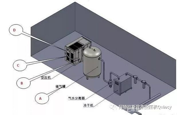 A)配套設(shè)備安裝順序要求如圖,“空壓機(jī)→儲(chǔ)氣罐→氣水分離器→冷干機(jī)”的安裝順序能有效利用氣體流動(dòng)特性提前排出水分降低冷干機(jī)負(fù)荷。